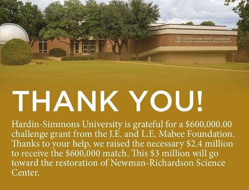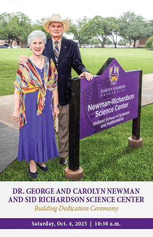 The Sid Richardson Science Center received its name due to the generosity of The Sid Richardson Foundation. Like the Sid Richardson Foundation, over the years the Newmans have blessed Hardin-Simmons with their generosity. The planned renovations on Sid Rich, in conjunction with the speakLIFE campaign, provided the catalyst for honoring Dr. George and Mrs. Carolyn Newman. In recognition of the Newmans’ impact on the campus, their family name will be permanently affixed next to Sid Richardson’s, encompassing all the resources as the Newman-Richardson Science Center.